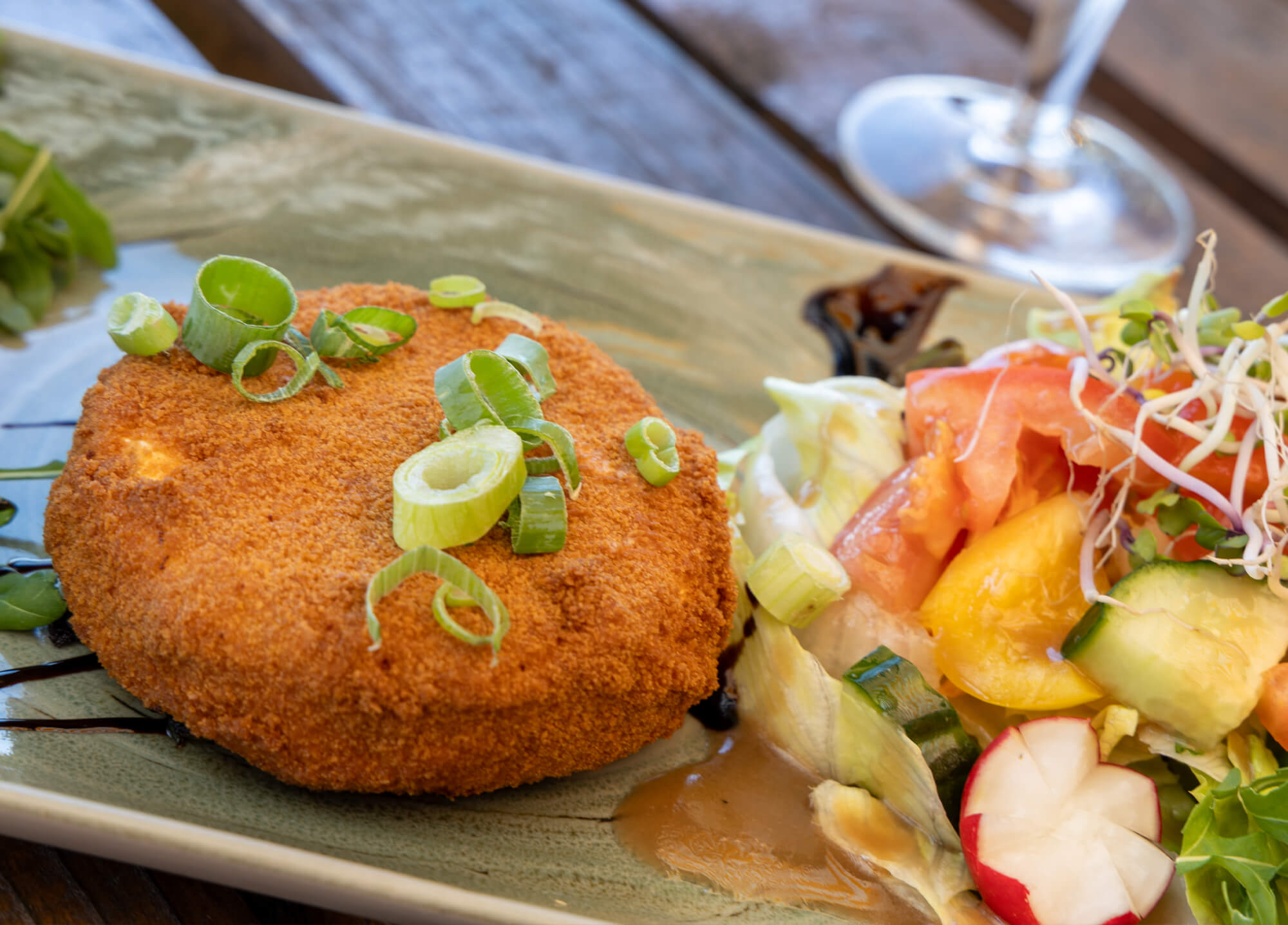 Ganzer gebackener Camembert auf großem Salat, dazu Preiselbeeren – warm, würzig, perfekt zum Löffeln und Dippen.
